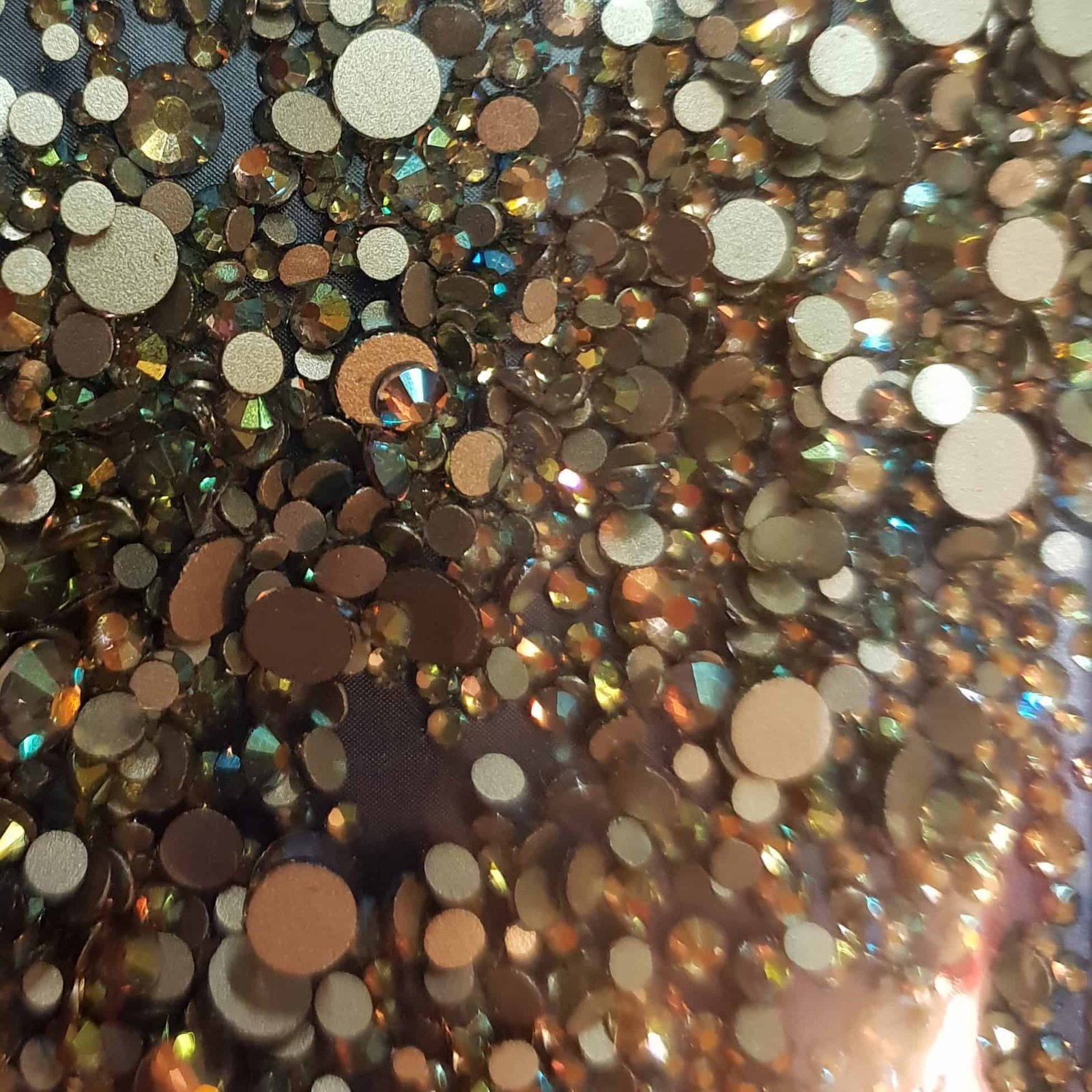 Confezione contenente circa 288 strass di varie misure, fondo piatto, colore Bronzo olografico